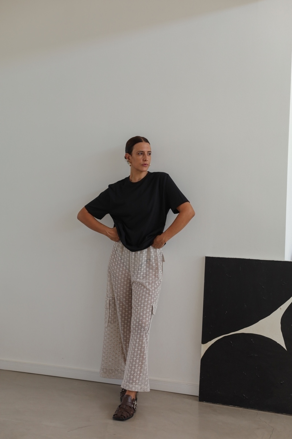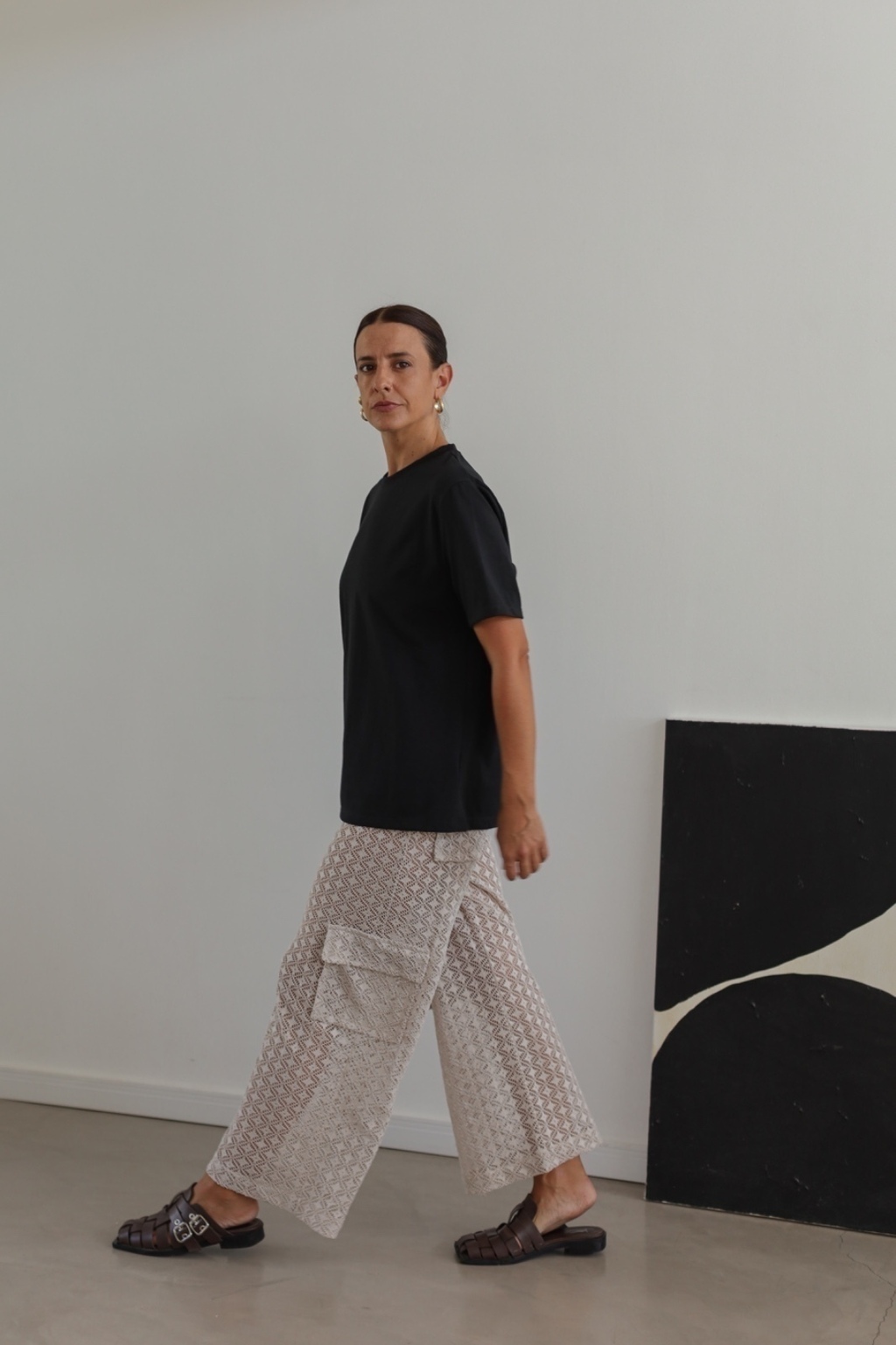 Pantalón recto confeccionado en textil de punto estilo crochet, tiene cintura elástica y bolsillos con solapa en la cola y en los laterales.