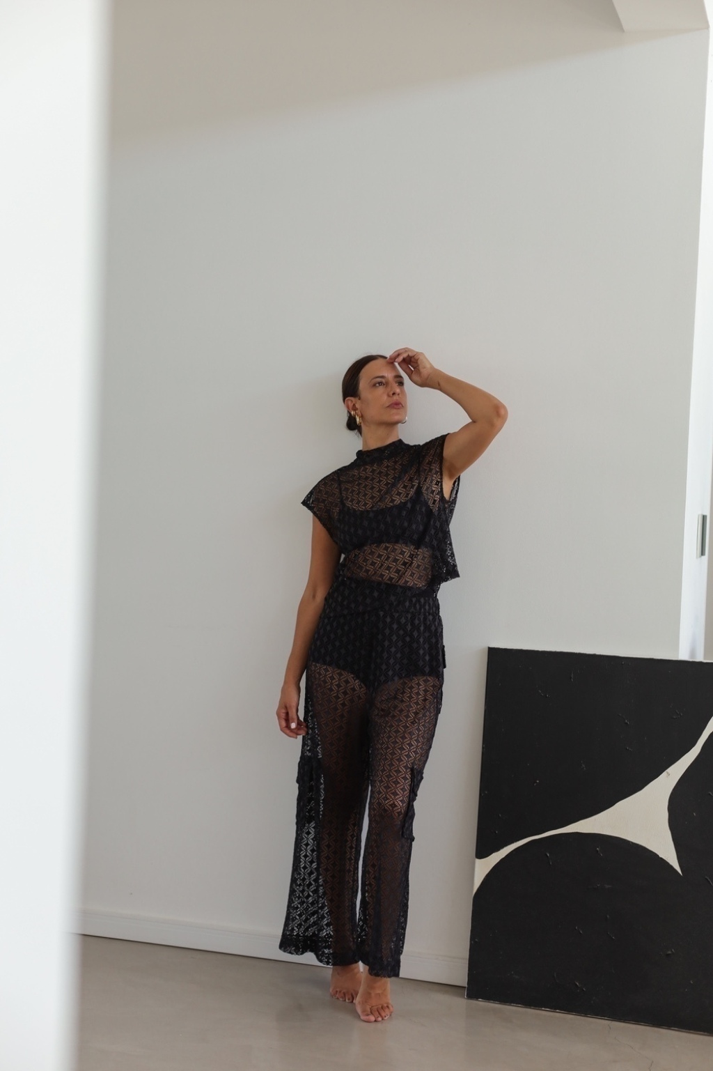 Pantalón recto confeccionado en textil de punto estilo crochet, tiene cintura elástica y bolsillos con solapa en la cola y en los laterales.