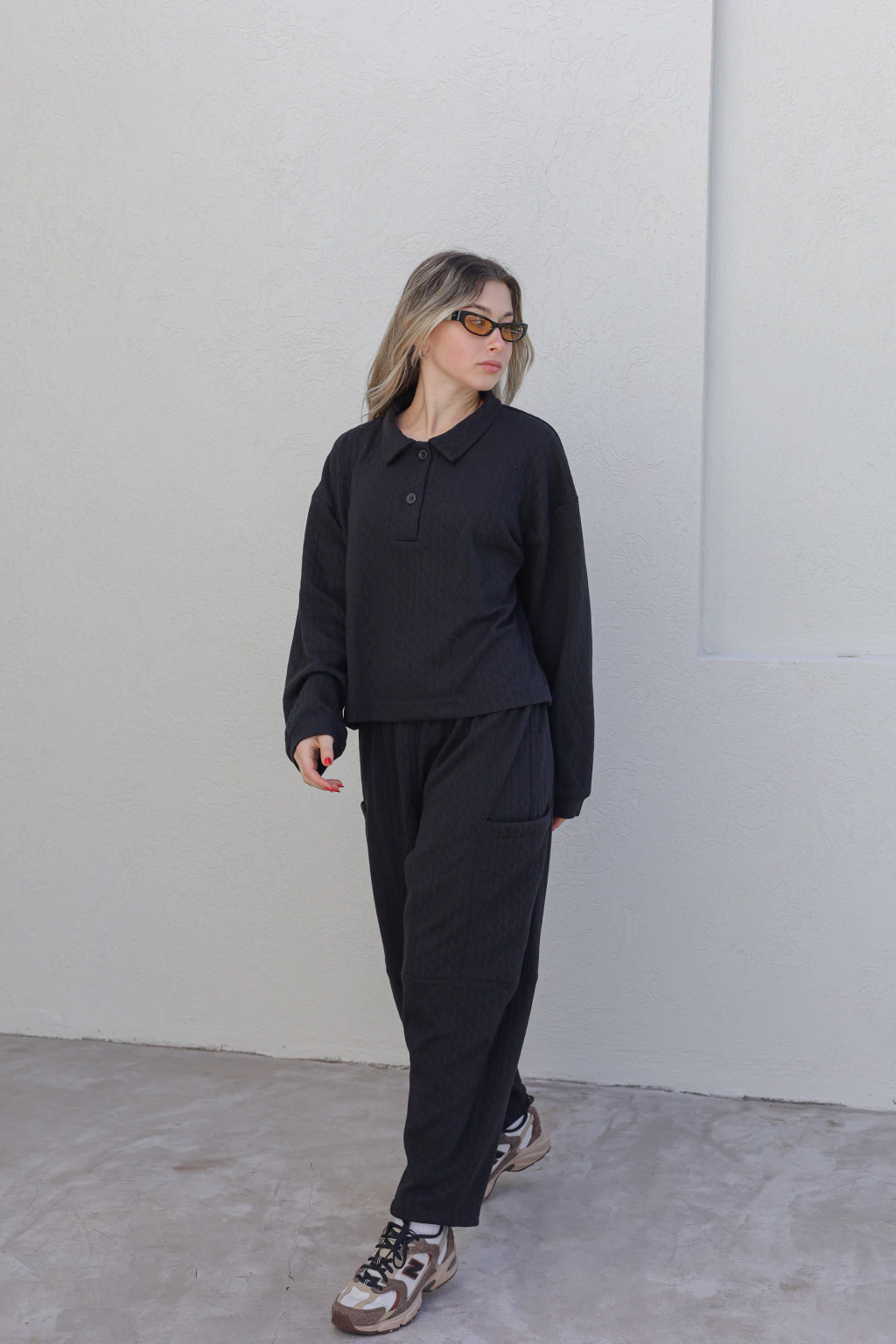 Pantalón holgado de piernas anchas. Posee cintura elàstizada con elàstico de 4cm que recubre todo el controno y bolsillos grandes en los laterales.