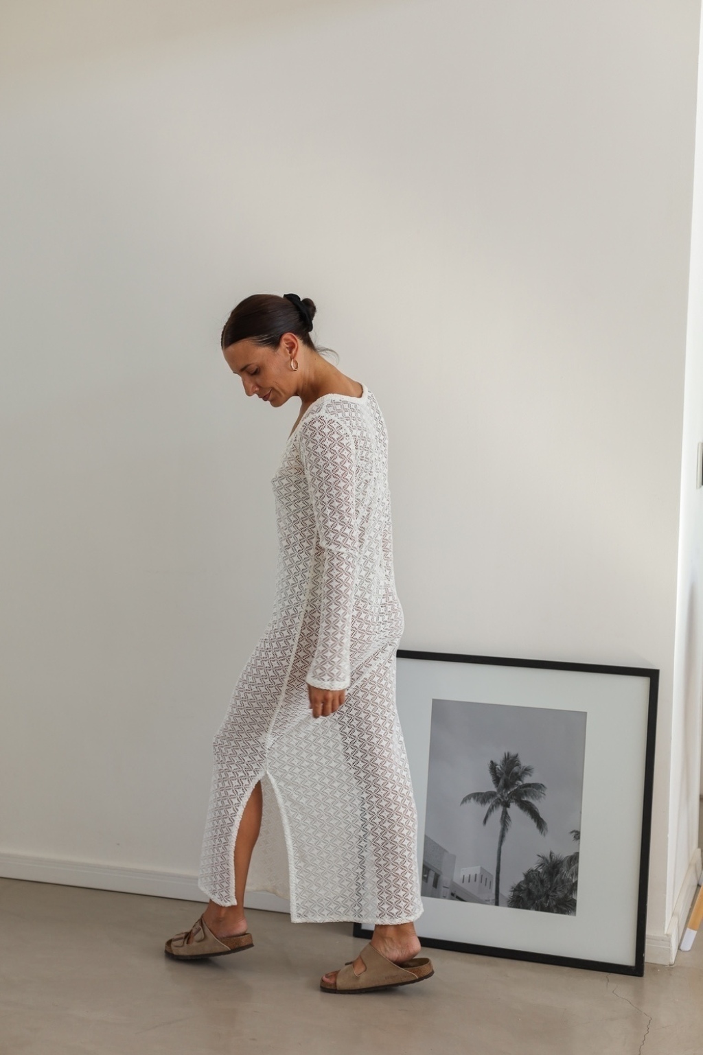 Vestido largo confeccionado en textil de punto estilo crochet, con mangas levemente acampanadas. Posee dos tajos a los costados en los laterales.